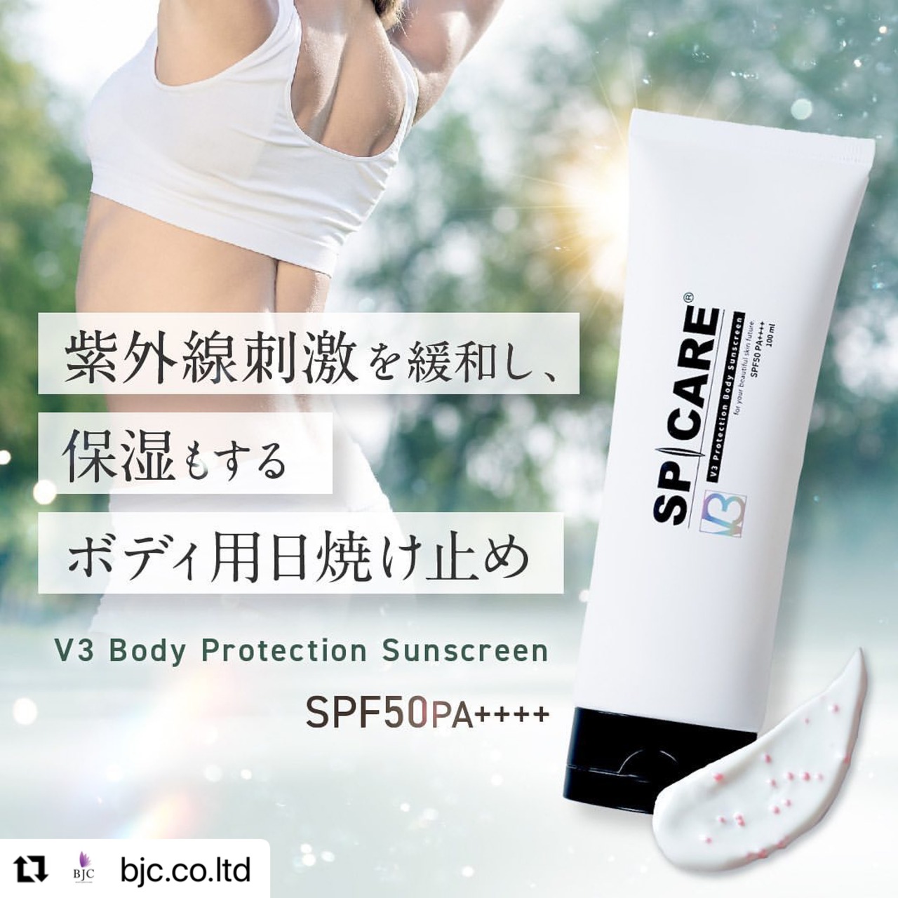 【SPICARE】V3プロテクションボディサンスクリーンは、しっかりと日焼けを防ぎながら、肌を優しくケアする新しいサンスクリーンです!軽やかな使用感で、塗布後すぐにべたつかず、快適な肌触りを実現します。